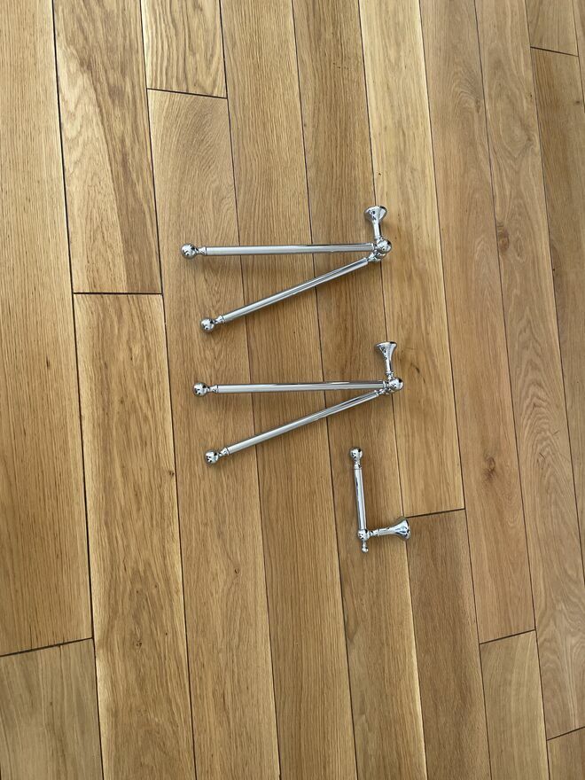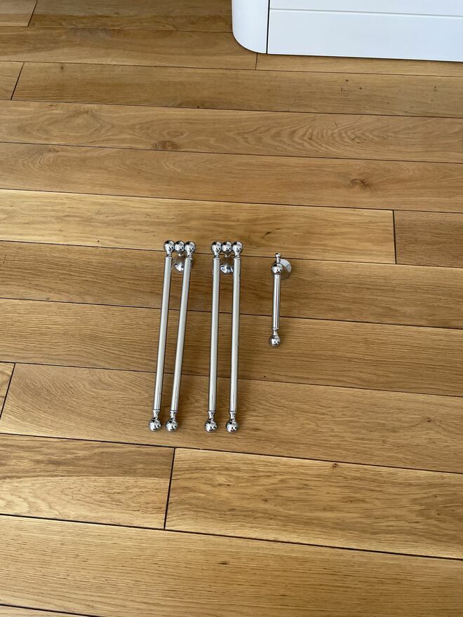 Komplet wieszaków do łazienki wykonanych z wysokiej jakości materiałów (chrom). Nadają się do montażu na ścianie i zapewnia praktyczne miejsce do zawieszenia ręczników większych i mniejszych lub innych akcesoriów łazienkowych. Długość pałąka 38 cm, odległość od ściany 7,5 cm. W komplecie także wieszak na papier toaletowy (długość pałąka 19 cm, odległość od ściany 7,5 cm). Solidna konstrukcja i elegancki design sprawią, że będzie on dobrze prezentował się w łazience. Odbiór osobisty.Monika