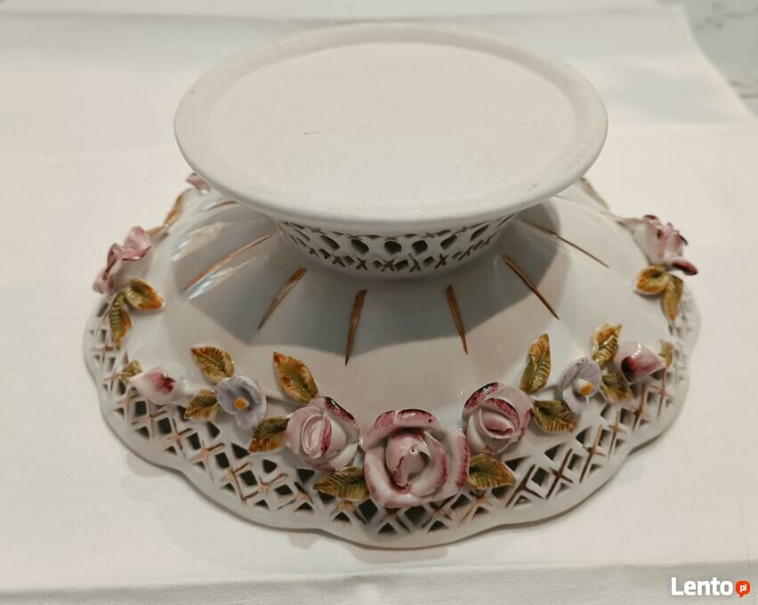 Komplet z porcelany 18 szt:Elementy są różnej wielkości i wysokości, wykonane wzorem ażurowym oraz maja dodatkowe elementy w kształcie róż.