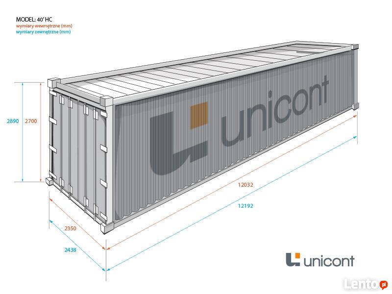 Wymiary kontenera typu 40 DV są identyczne jak 20 DV ale oczywiście z długością 12 192 mm