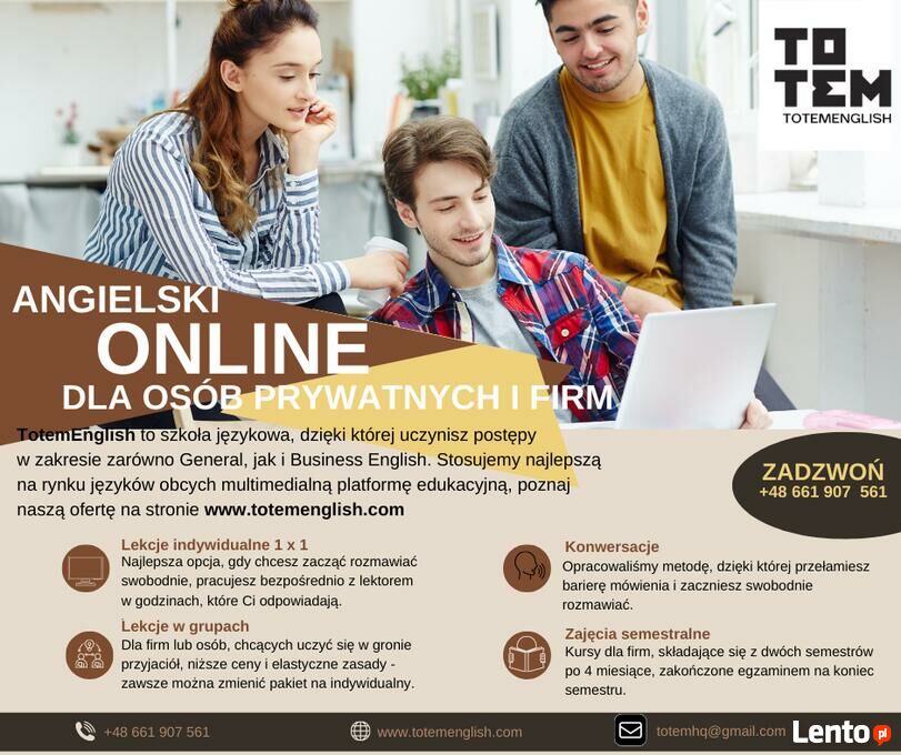 TotemEnglish oferuje elastyczne kursy angielskiego dostosowane do indywidualnych potrzeb - bazujemy na uniwersalnej platformie multimedialnej online, zapewniającej kompleksową, atrakcyjną formę nauki angielskiego.Przygotowanie do testów, egzaminów, matury podstawowej i rozszerzonej, certyfikatu CAE, egzaminy IELTS