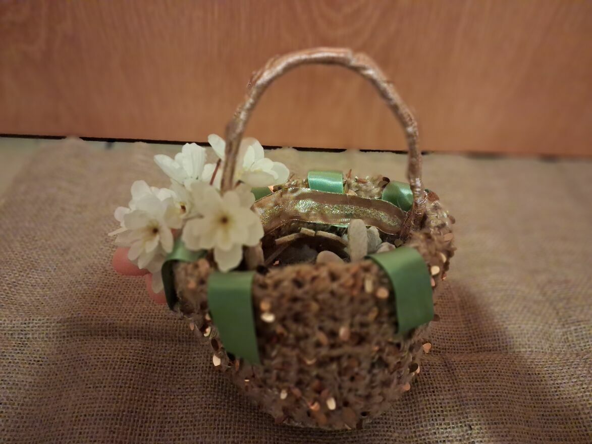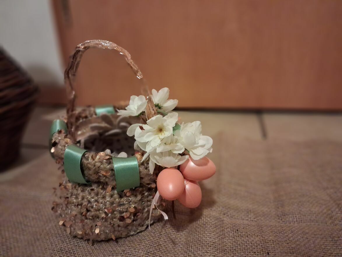 Elegancki koszyczek wielkanocny wykonany z włóczki ze złoceniami. Elementy dekoracyjne :kolorowe jajka i kwiaty,tworzą piękną, wiosenną dekoracjęSprawdź zainteresowanie tym ogłoszeniem
