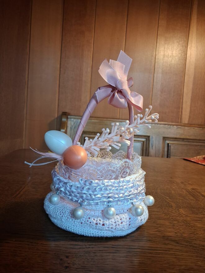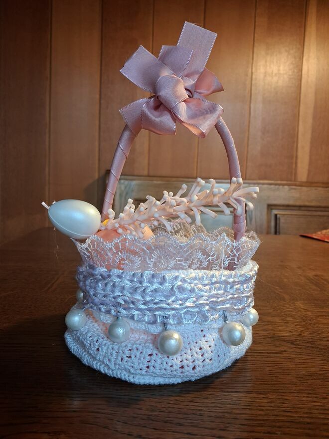 Ręcznie wykonany koszyczek wielkanocny ze sznurka bawełnianego,w białym kolorze ozdobiony dekoracjami świątecznymi , koronką , perłowymi kulkami steropianowymi.Sprawdź zainteresowanie tym ogłoszeniem