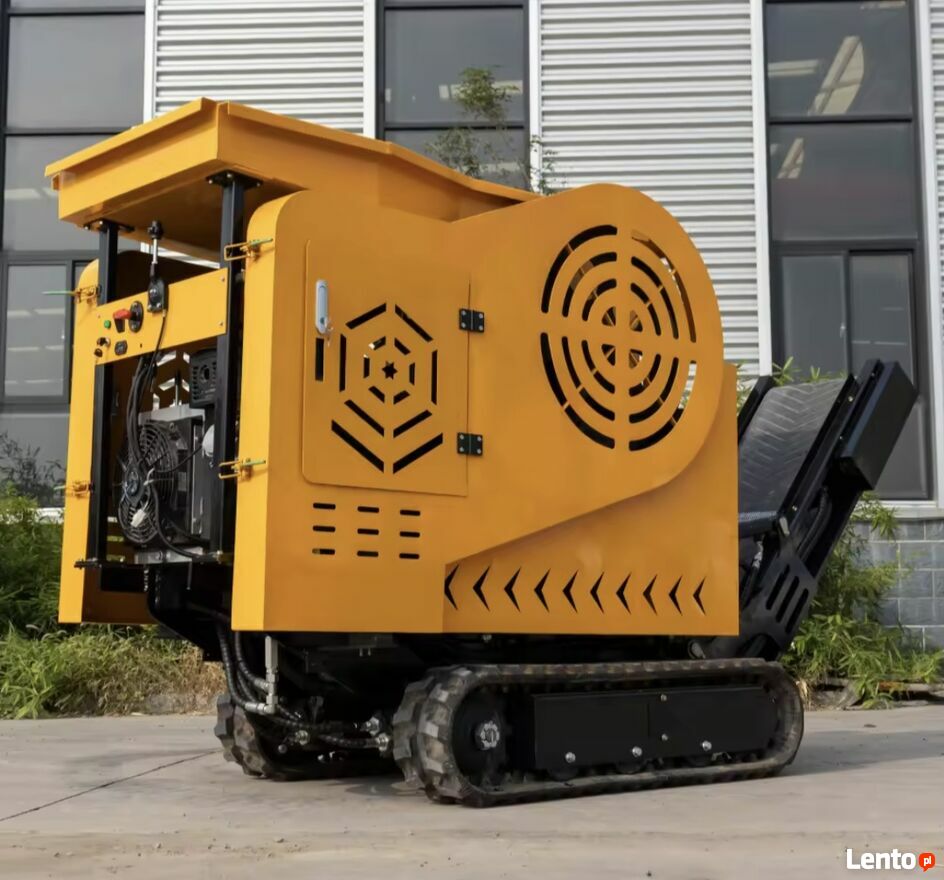 Kruszarka jest na gąsienicach, co ułatwia przemieszczanie jej po placu budowy.