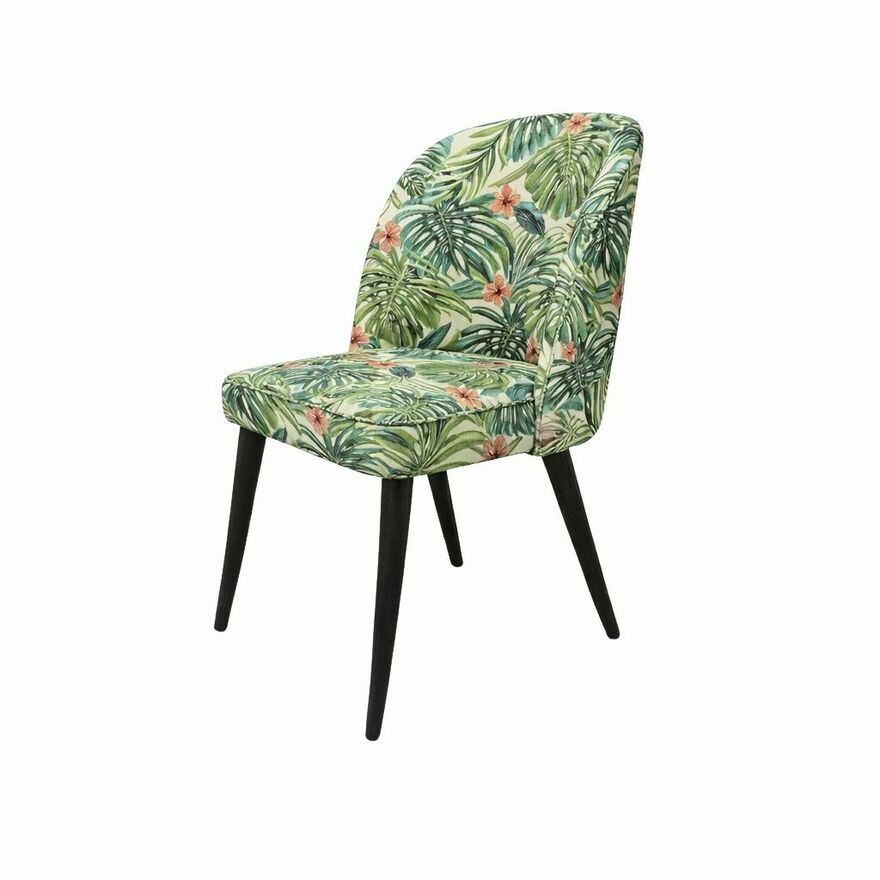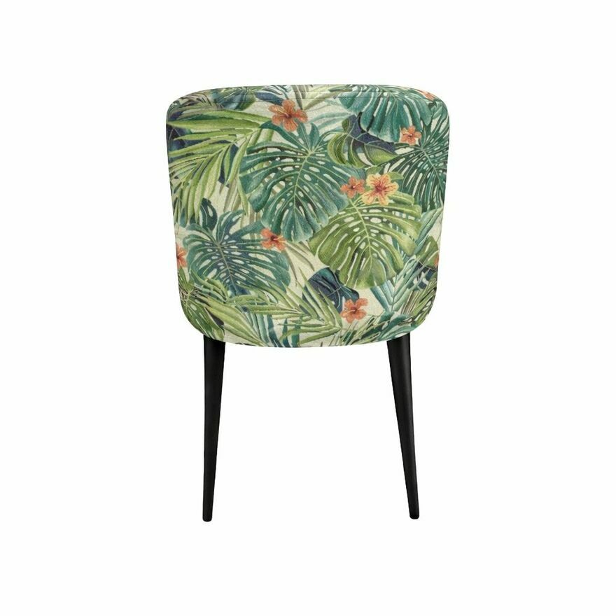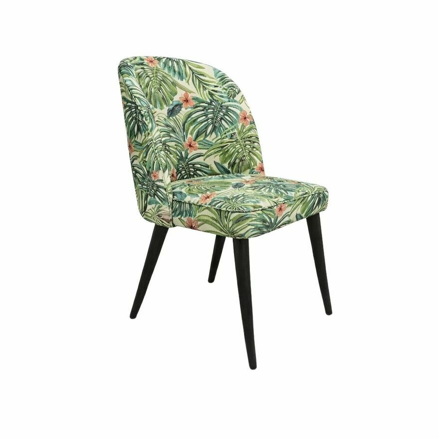 Krzesło zostało tapicerowane wysokiej jakości tkaniną Jungle White o strukturze żakardowej i dekoracyjnym, kwiatowym motywie. Materiał ten łączy estetykę z bardzo dobrymi właściwościami użytkowymi: