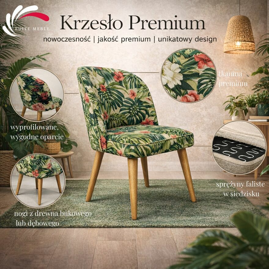 Krzesło Tapicerowane Premium KL-2 Jungle White to idealny wybór dla osób, które szukają wygodnego, solidnego krzesła z ozdobną, kwiatową tapicerką i właściwościami premium.