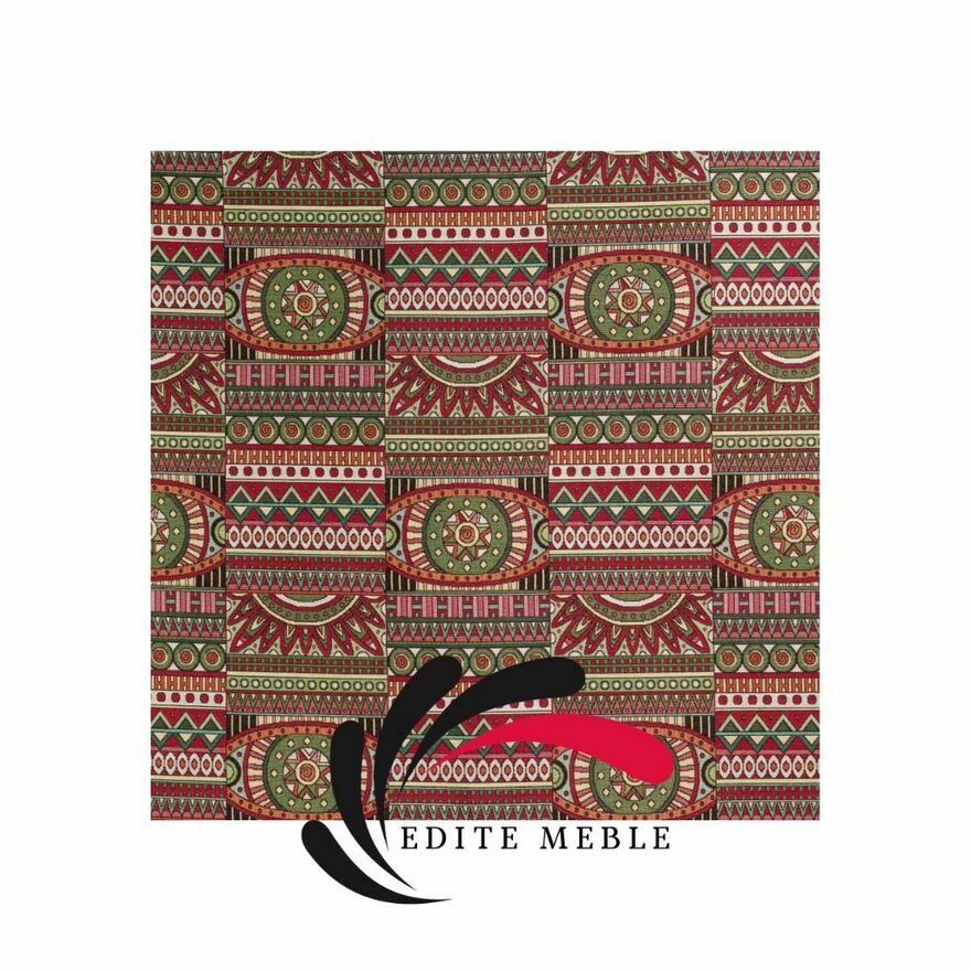 Tkanina RAJA – Colors to wysokiej jakości hiszpański żakard tapicerski o spektakularnym, etnicznym wzorze i energetycznej kolorystyce. Geometryczne motywy tworzą dynamiczną, a jednocześnie harmonijną kompozycję, która: