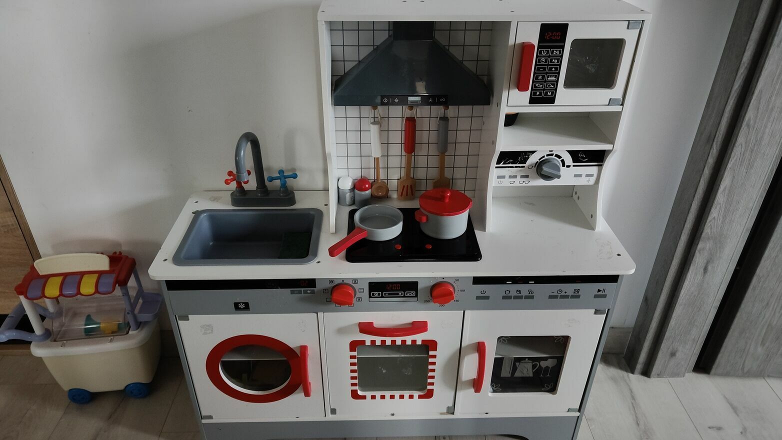Sprzedam dużą, drewnianą kuchenkę do zabawy dla dzieci. Kuchenka porządnie wykonana, używana, nosi gdzieniegdzie ślady użytkowania (odrapania), ale jest w pełni sprawna.Do kuchenki dołączam gratis drewniany toster i plastikową lodziarnię widniejące na zdjęciach.