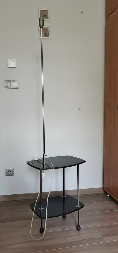 Wygodna do kładzenia książek, telefonu, okularów itd. Blat górny i dolny był kilkanaście lat temu odnowiony. Nóżki, metalowa niklowana rurka z regulacją wysokości abażura i instalacja elektryczna w stanie oryginalnym. Odbiór osobisty Warszawa Wawer - blisko stacja PKP i przystanków MZK.