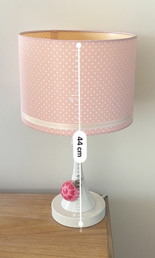 Różowa lampka nocna w białe kropki na białej metalowej podstawie. Wysokość ok. 44 cm, gniazdo E27 – pasuje większość standardowych żarówek.Abażur z tkaniny w delikatny wzór w kropki, wykończony kremową wstążką u dołu. Na nóżce różowa ozdobna kulka, całość wygląda ładnie w pokoju dziecięcym.