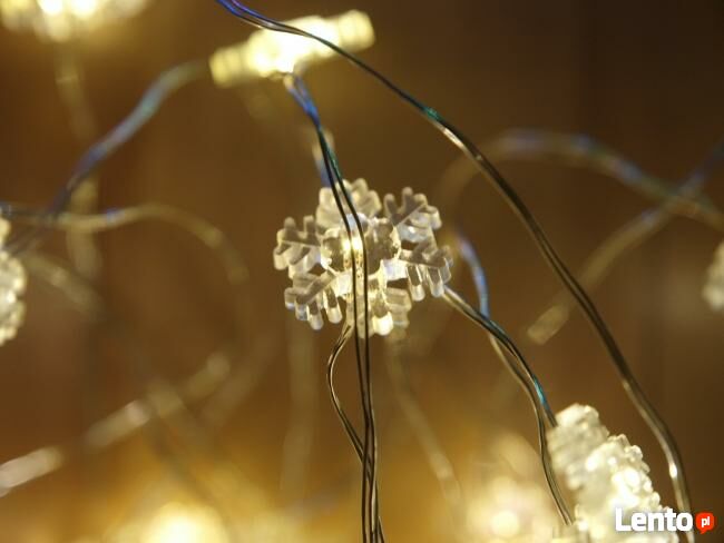 3/ BIAŁE LAMPKI z nakładkami na ledy W KSZTAŁCIE ŚNIEŻYNEK - sznur o długości 220cm , 30 białych lampek LED , zasilana bateriami 3x AA (brak w opakowaniu)