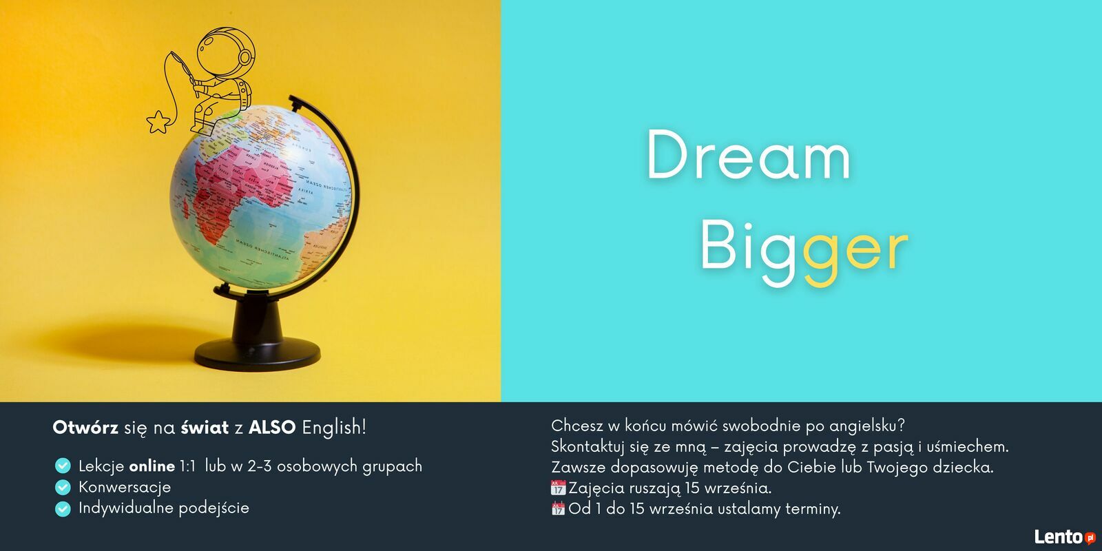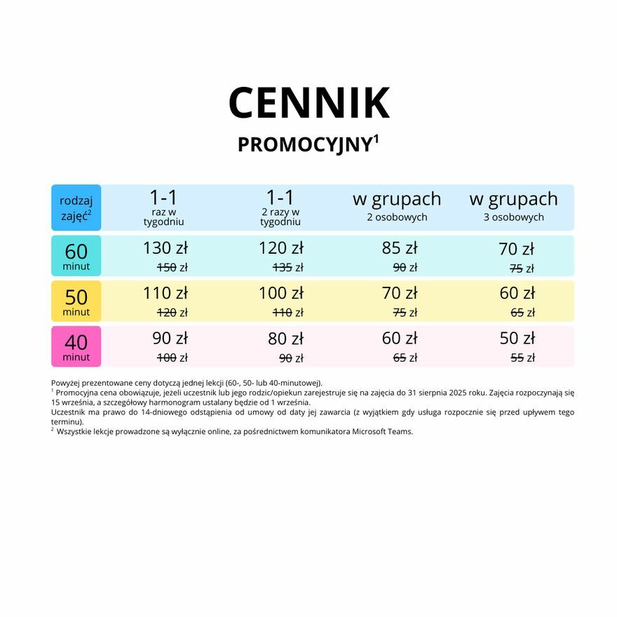 Zajęcia prowadzę online – w przyjaznej atmosferze, bez stresu, z zaangażowaniem, zrozumieniem i uśmiechem.