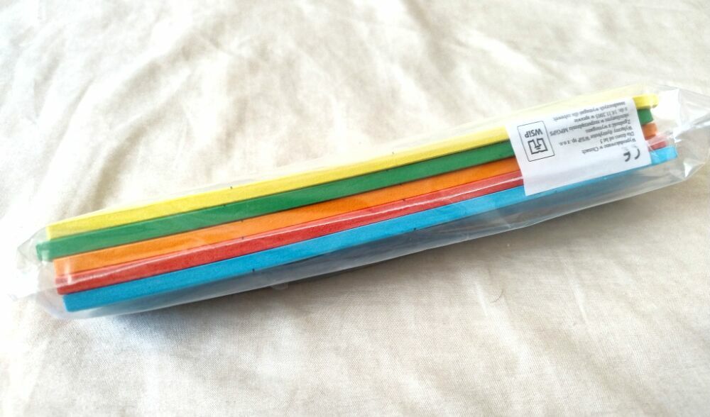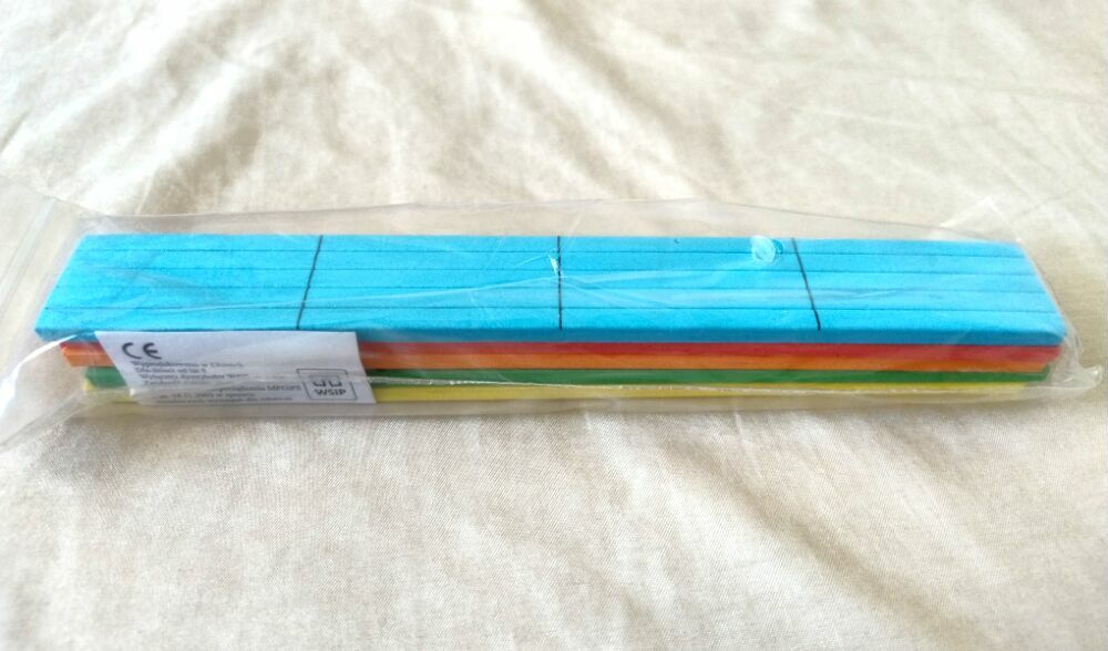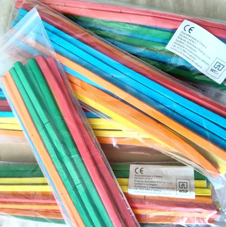 W skład jednego zestawu wchodzi 100 patyczków w następujących kolorach: 20 patyczków w kolorze czerwonym, 20 patyczków w kolorze pomarańczowym, 20 patyczków w kolorze żółtym, 20 patyczków w kolorze niebieskim, 20 patyczków w kolorze zielonym.