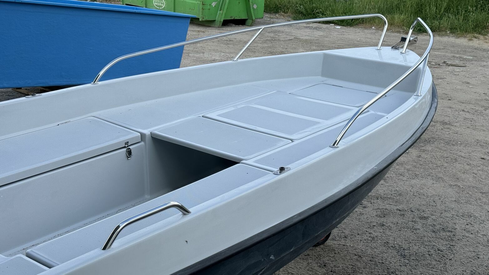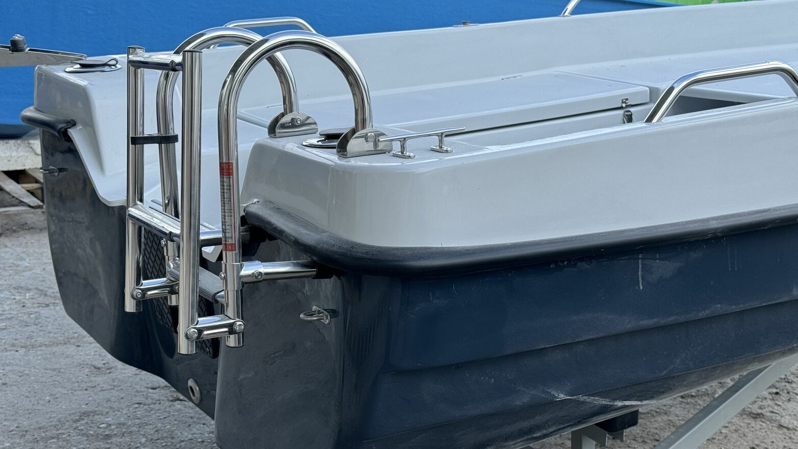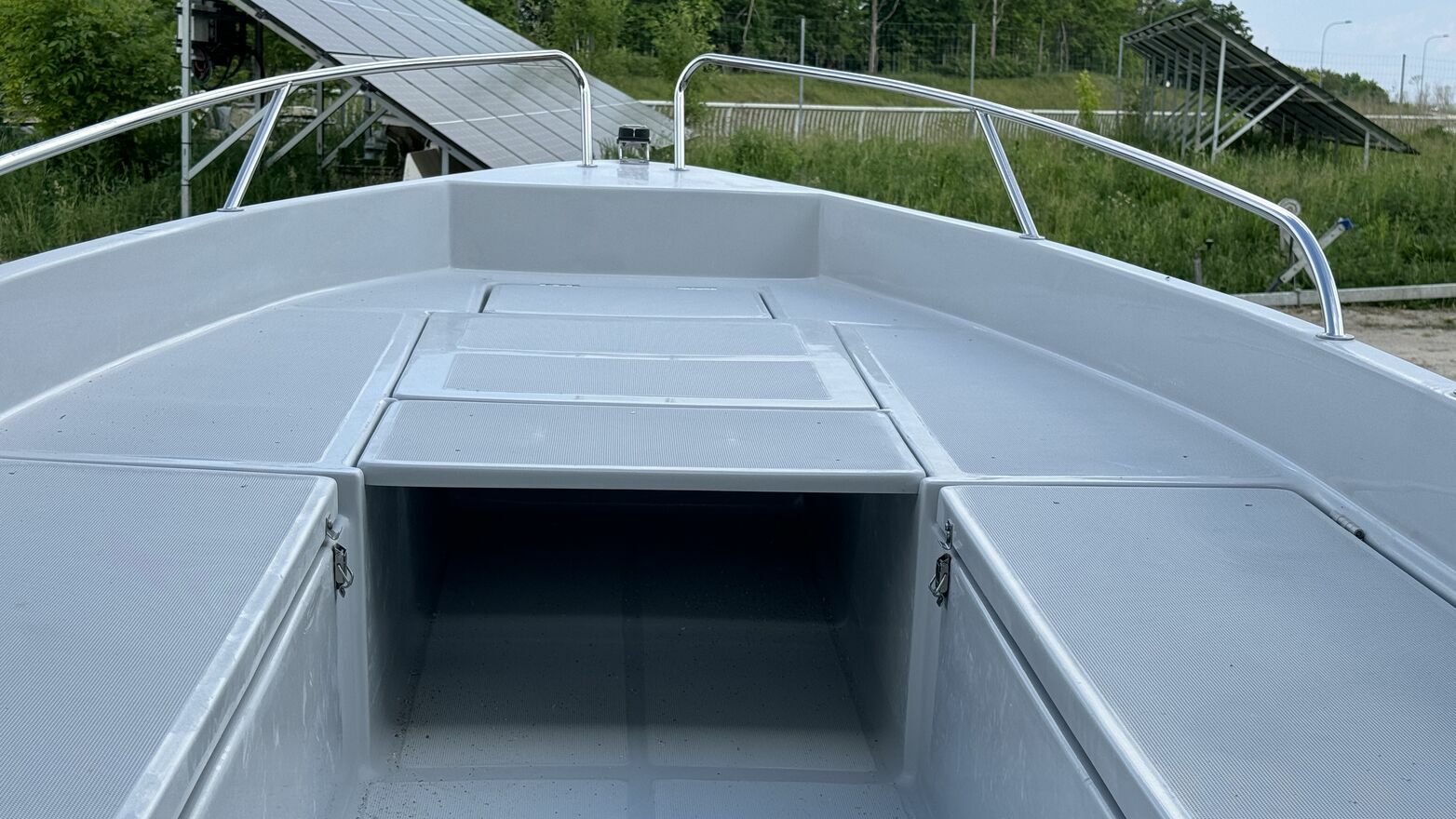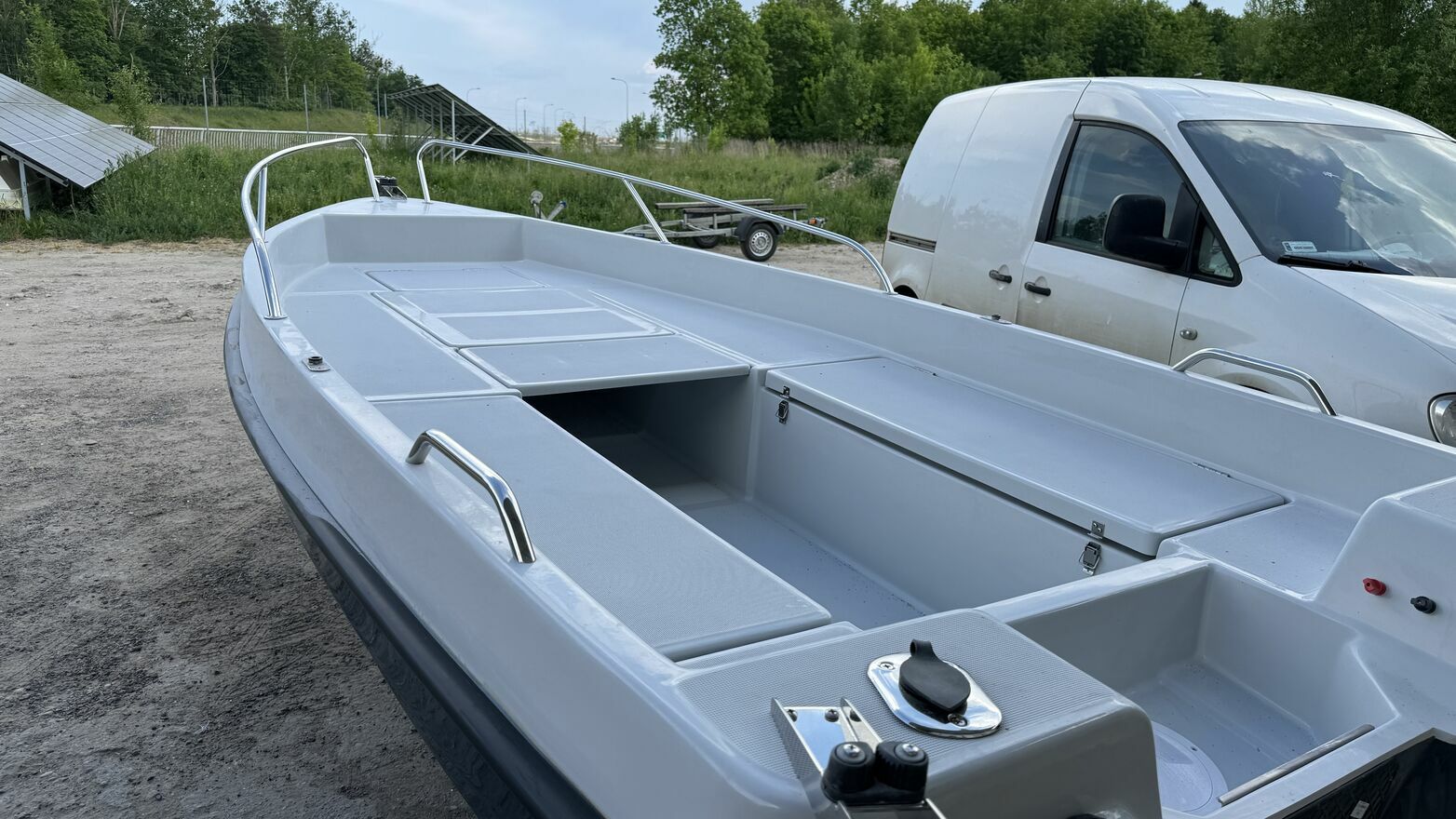 Łódka rekreacyjno-wędkarska z drabinką i pokładem słonecznym
