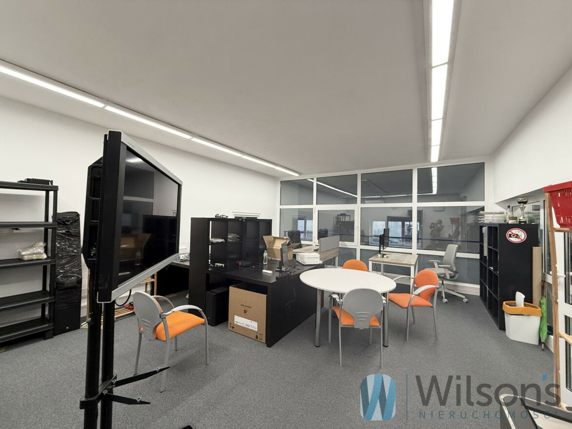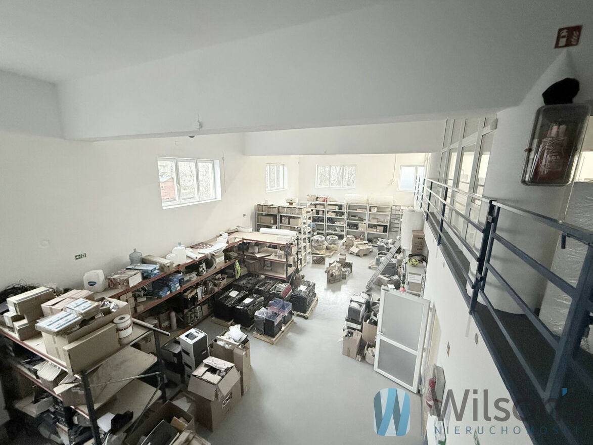 Na górze z widokiem na magazyn: duży open space podzielony na 4 przeszklone pomieszczenia