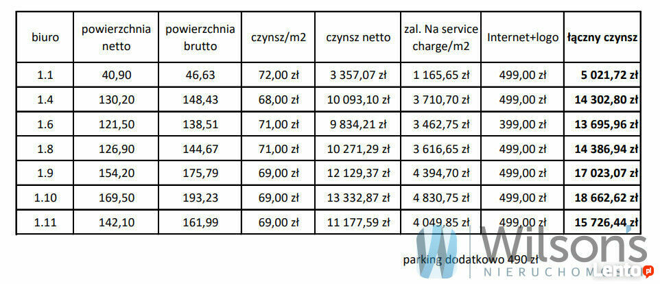 - miejsca parkingowe ( 1mp -> 490 PLN/netto )