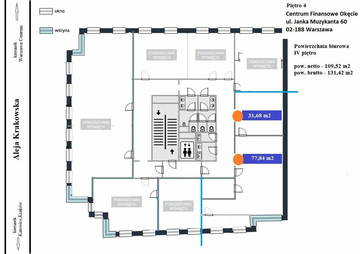 IV p - 109,52 m2 netto, czynsz 13 euro za m2 + koszty eksploatacyjne 20 zł. za m2.
