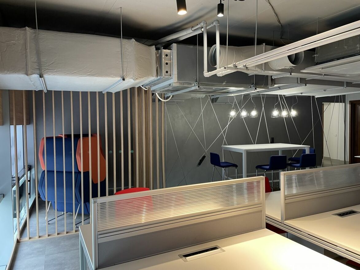 Nowocześnie wykończony i w pełni wyposażony lokal biurowy; recepcja oraz open space (razem 50 m2), open space #2 (50 m2), pokój (25 m2) z możliwością podziału na 2 mniejsze, i sala konferencyjna (20 m2). Dodatkowo serwerownia, kuchnia, WC. Możliwy przydział mocy do 40kW.