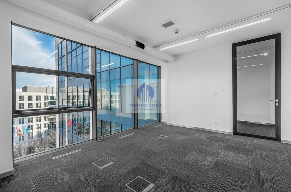 Przestronne i bardzo dobrze doświetlone biuro w budynku ze szklaną elewacją, zapewniającą doskonały dostęp do światła dziennego.