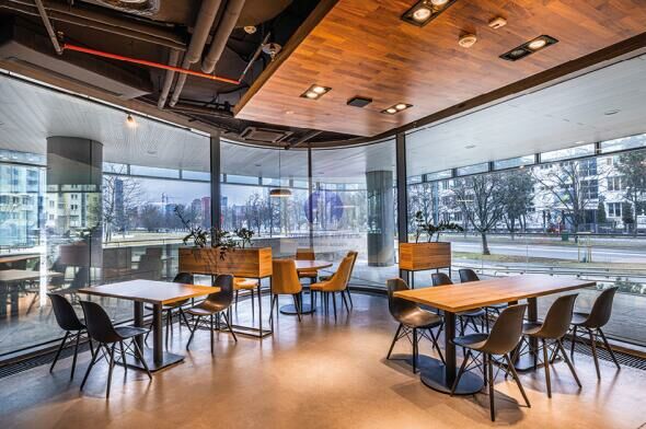 Optymalny dostęp światła dziennego do powierzchni biurowej: okna od sufitu do podłogi.
