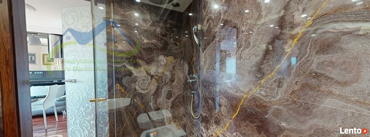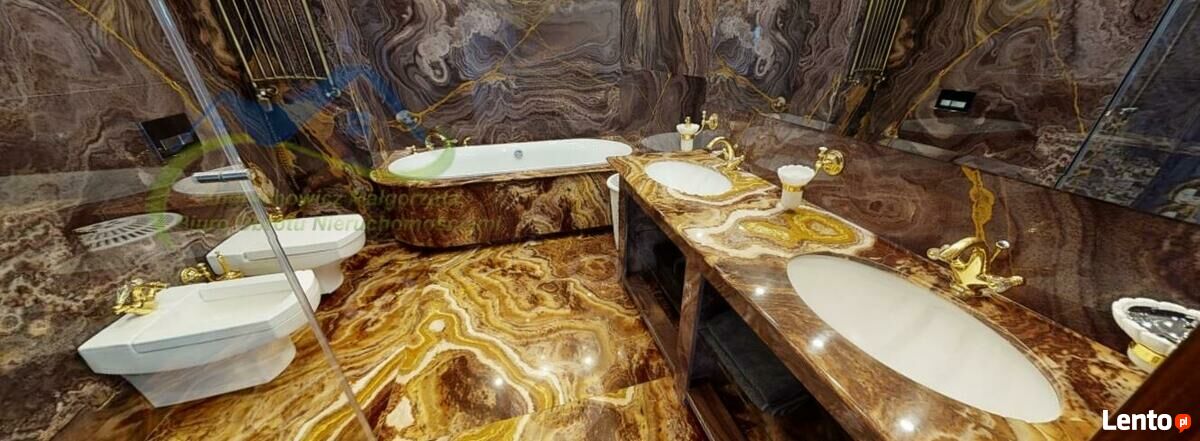 Łazienka ok.11m2 z 2 umywalkami, wanną, kabiną prysznicową, toaletą i bidetem - wykończony kamieniem onyks;