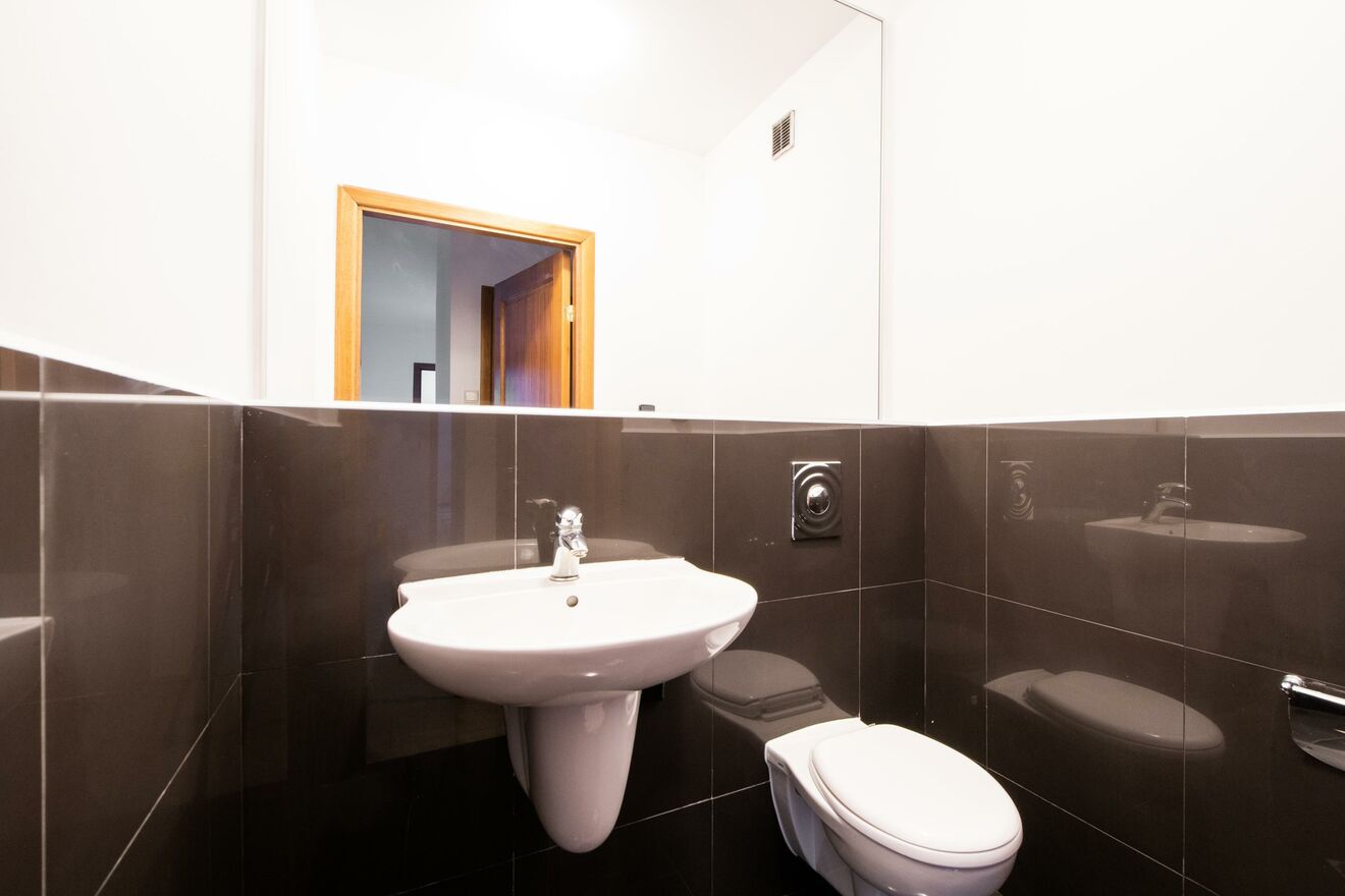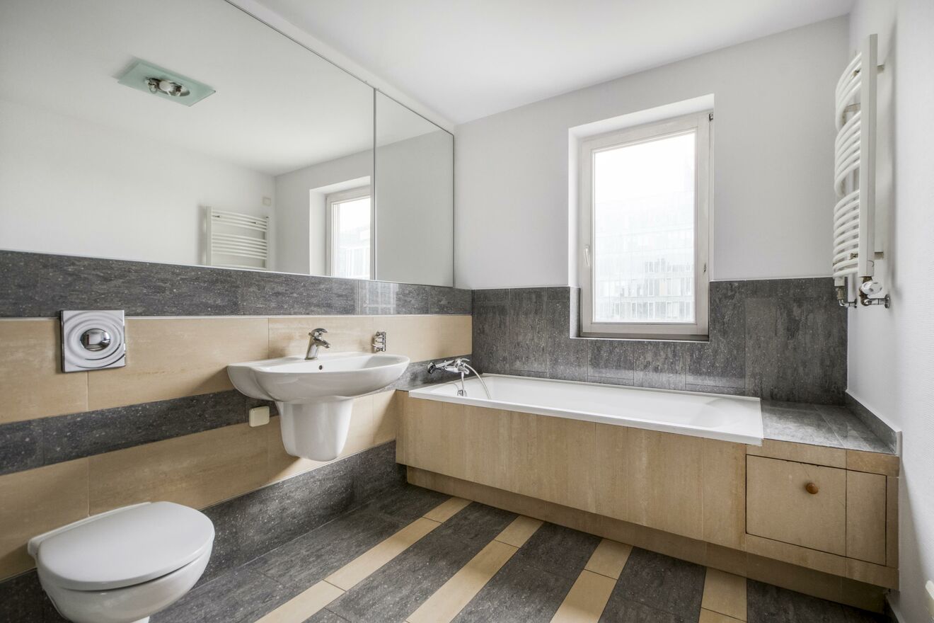 W mieszkaniu znajduje się zarówno łazienka, jak i osobna toaleta. Łazienka wyposażona jest w wannę, prysznic, umywalkę oraz WC.