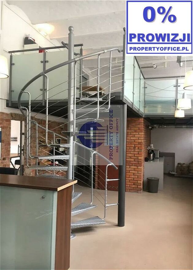 Jedno duże pomieszczenie z przestrzenią biurową zaaranżowaną na antresoli, na którą wiodą spiralne schody.