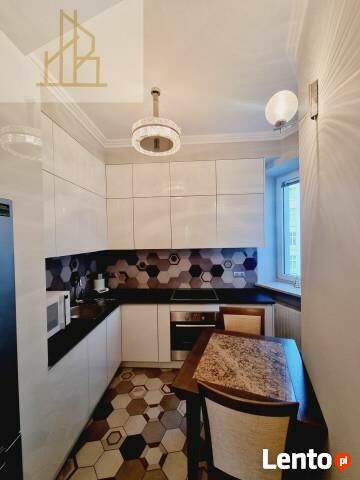 Kuchnia nowoczesna (okno od strony wewnętrznego podwórka ale nie na tzw. studnię) w pełni wyposażona, zabudowana szafkami MDF w kolorze białym, blat granitowy czarny, gres na podłodze, lodówka, zmywarka w zabudowie, mikrofala, czajnik, pralka w zabudowie, talerze, sztućce. Żyrandol "Art deco". Stół drewniany i dwa krzesła;