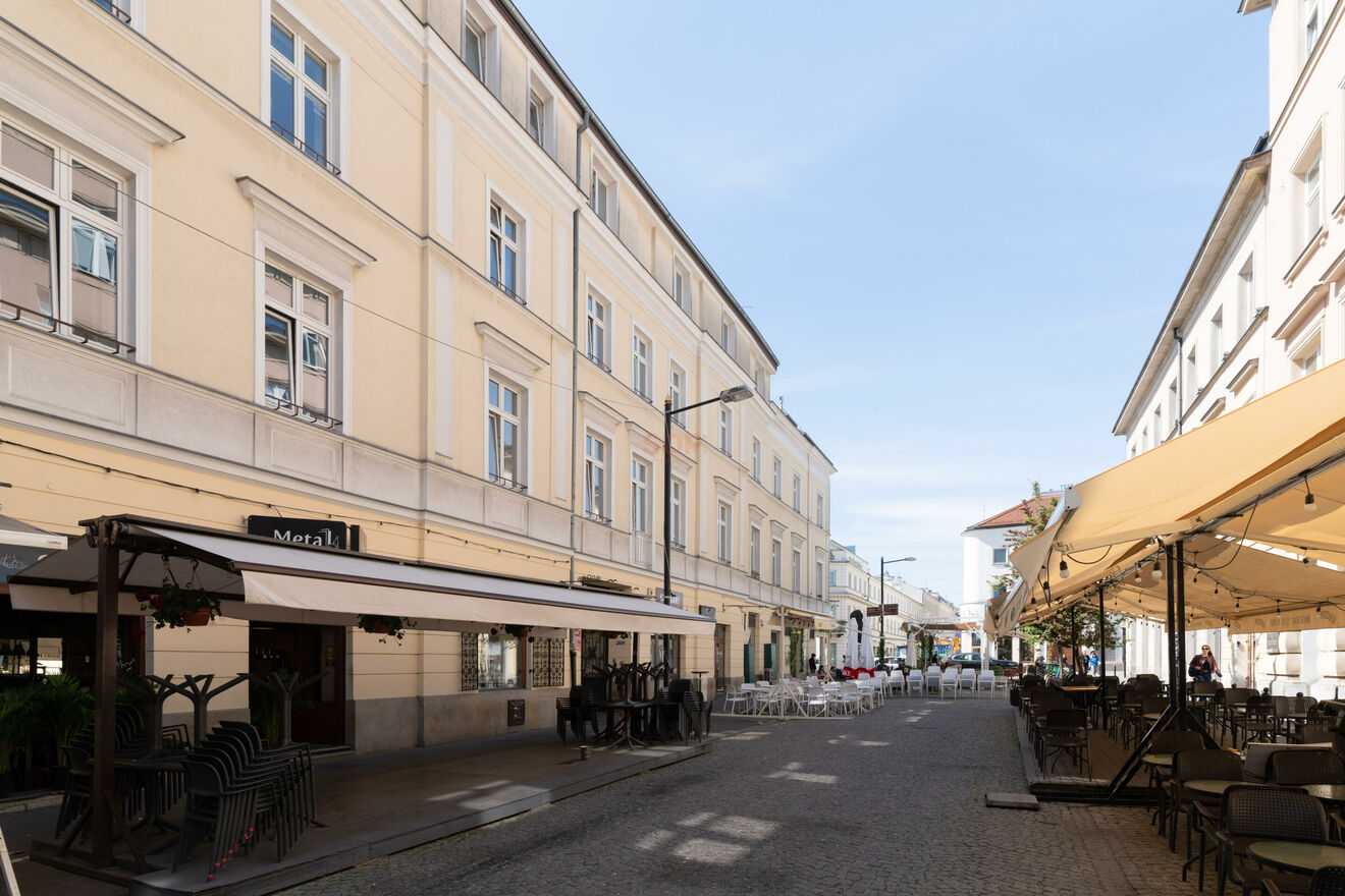 Mieszkanie mieści się przy jednej z najbardziej prestiżowych ulic Warszawy. Zapewnia nam to dostęp do pełnej infrastruktury miasta. W sąsiedztwie znajdują się sklepy spożywcze, oraz liczne punkty usługowe i lokale gastronomiczne.