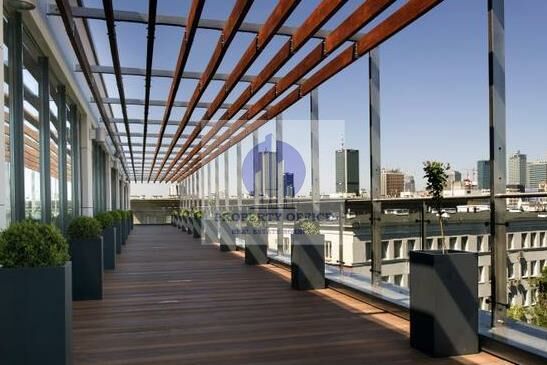 Na najwyższej kondygnacji znajduje się taras oferujący niepowtarzalny widok na panoramę Warszawy.
