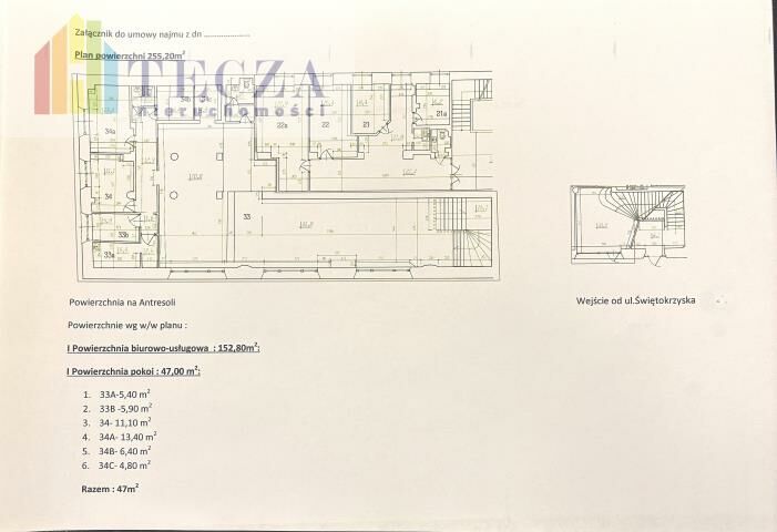 Do dyspozycji najemcy jest pow.255,2 m2 na I piętrze z własnym WEJŚCIEM Z ULICY na PARTERZE