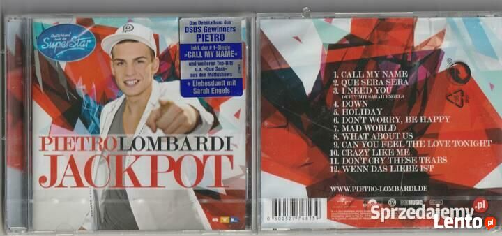 Lombardi, Pietro Jackpot CD 1 Call My Name 2 Que Sera Sera 3 I Need You Vocals [Duet] – Sarah Engels 4 Down 5 Holiday 6 Don't Worry, Be Happy 7 Mad World 8 What About Us 9 Can You Feel The Love Tonight 10 Crazy Like Me 11 Don't Cry These Tears 12 Wenn Das Liebe Ist Ogłoszenie jest aktualne dopóki znajduje się na stronie . Odbiór osobisty lub wysyłka Karton 94Sprawdź zainteresowanie tym ogłoszeniem