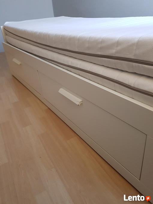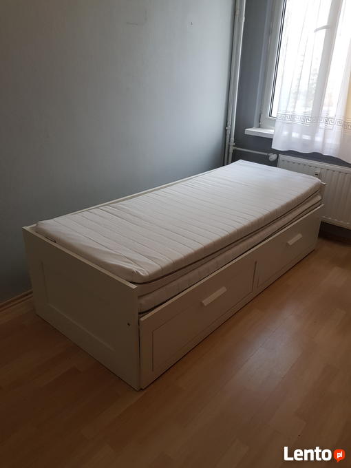 IKEA - UŻYWANA w Pełni Sprawne, posiada ślady jak na zdjęciach, powłoka na materacach posiada plamy pomimo kilkukrotnego prania w pralni.BRIMNES Leżanka z 2 szufladami, 2 materace, biały, Moshult twardy, 80x200 cm.