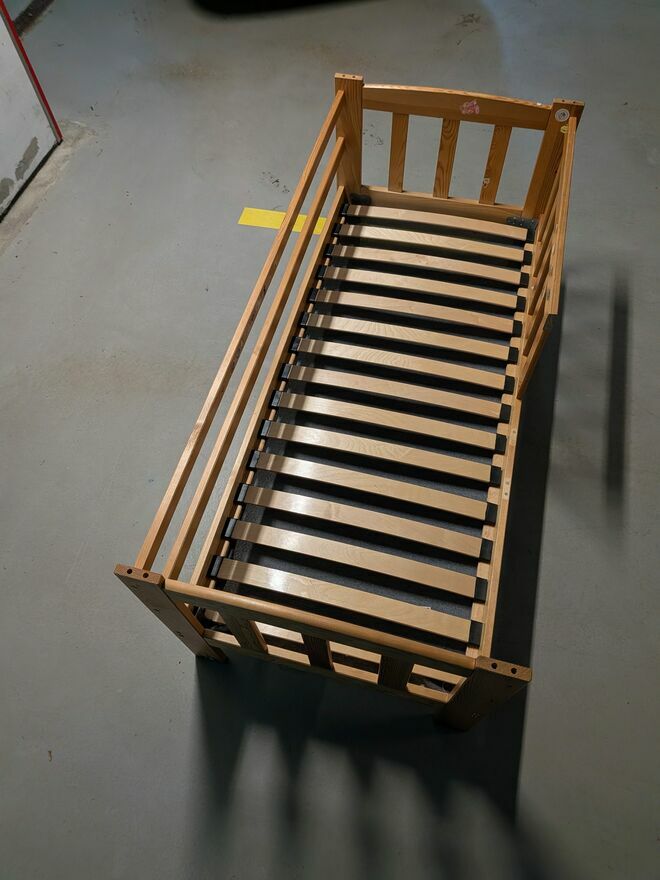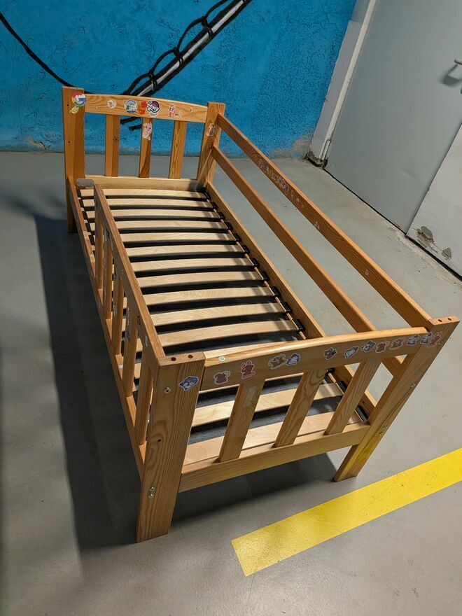 Solidne łóżeczko dziecięce z porządnym materacem o wymiarach 160x70 cm.Stan: dobry. Dużo śladów używania, trochę pomazane flamastrami, ponaklejane naklejki, ale w pełni sprawne. Od spodu obite materiałem, wzmocnione, dołożone poprzeczki tak, że spokojnie wytrzymuje gdy dorosła osoba usiądzie lub lub położy się z dzieckiem.
