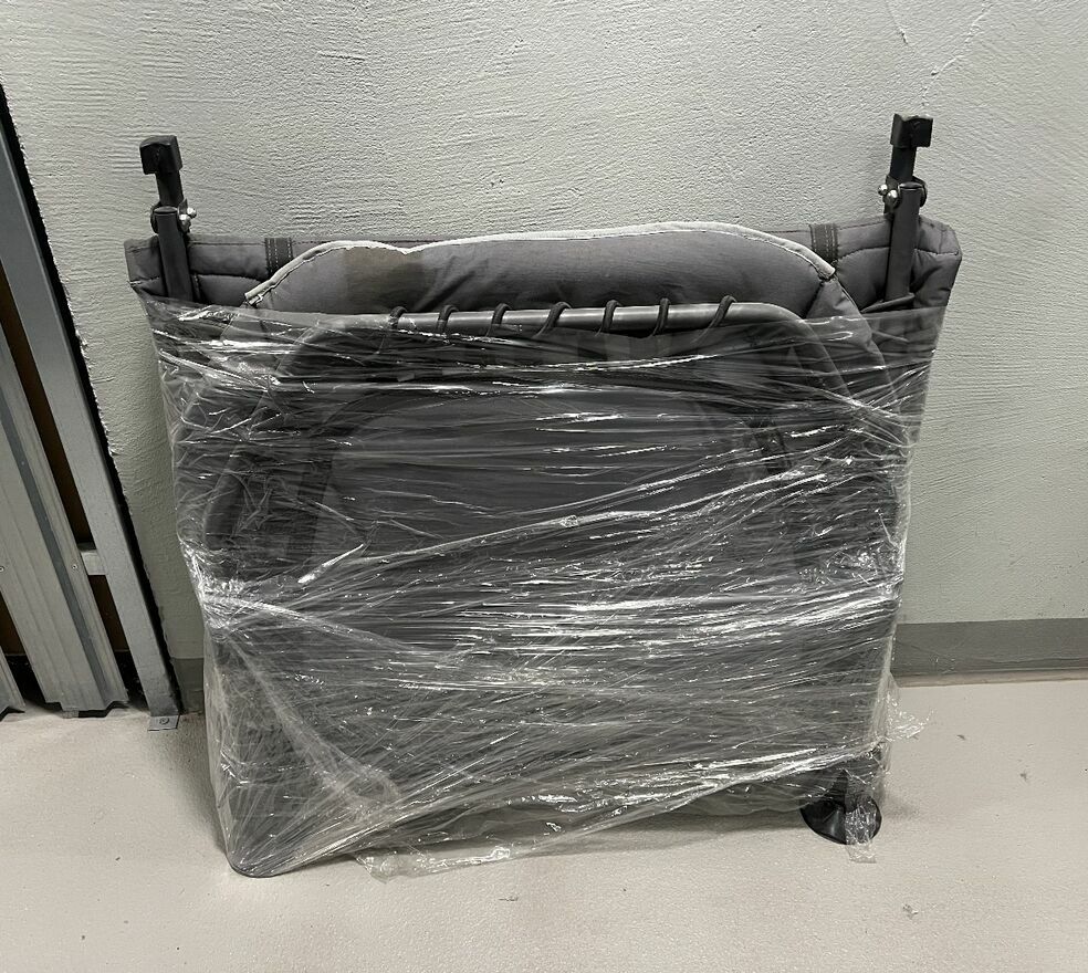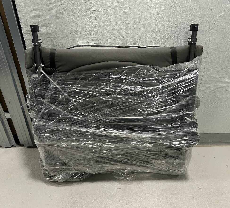 Łóżko polowe składane — idealne na biwak, kemping, do ogrodu albo jako dostawka dla gości. Metalowa rama z solidnymi klipsami zapewnia stabilność. Szary materiał, wbudowana poduszka/zagłówek.Łóżko jest w stanie używanym — przechowywane było w folii stretch. Wymaga prania materiału przed użyciem, ale konstrukcja jest sprawna i kompletna.