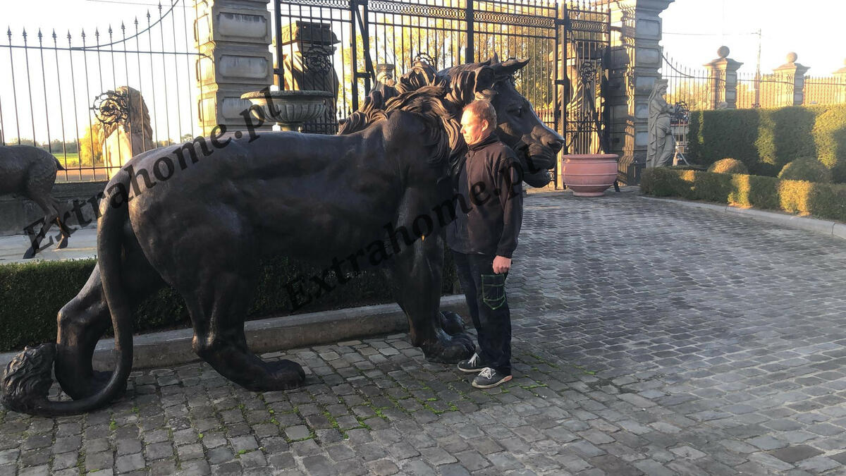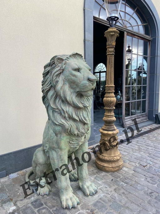 Para pięknych, ręcznie odlewanych z brązu patynowanego lwów wejściowych.