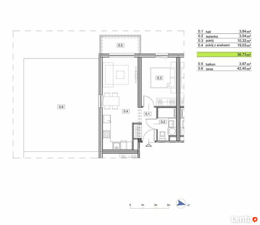 Oferowane 36,73 m2 - narożne 2 pokojowe mieszkanie z ogromnym tarasem
