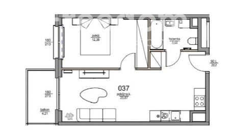 Pokój (12,38 m2)Salon z aneksem (23,87 m2) Łazienka (3,94 m2)