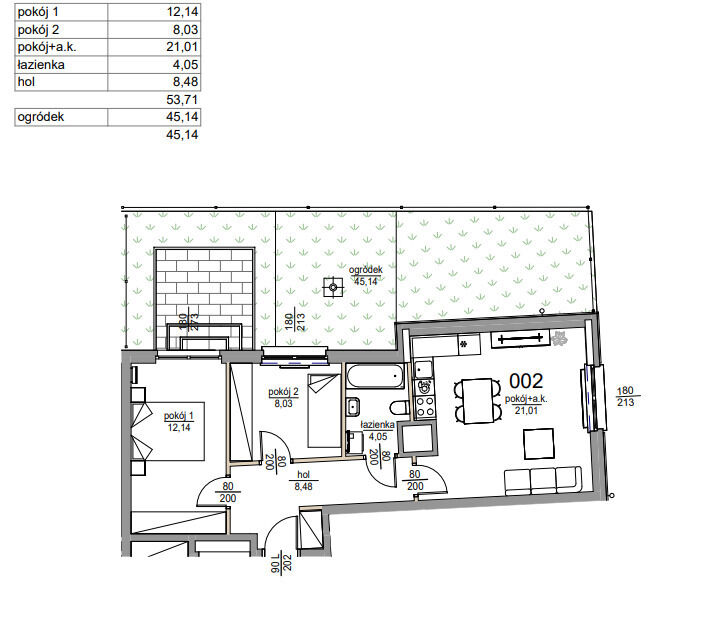Pokój 1 (12, 14 m2)Pokój 2 (8.03 m2) Salon z aneksem (21,01 m2)
