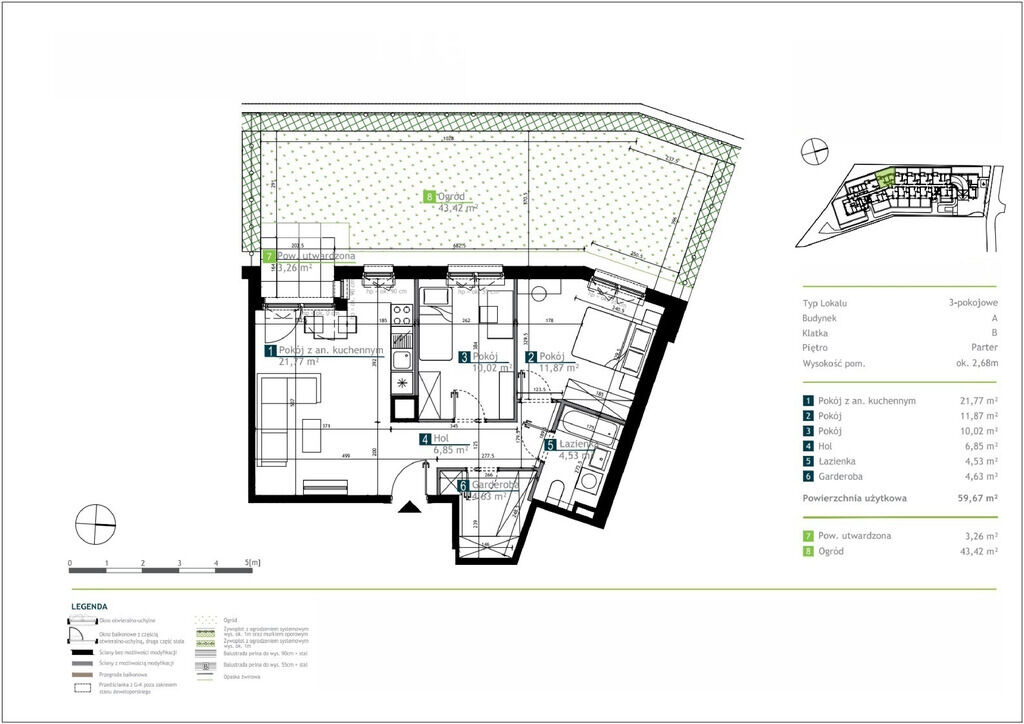 + Ogródek (43,42 m2) w tym taras (3,26 m2)