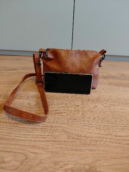 Sprzedam poręczną, brązową torebkę na ramię (crossbody).Stan używany, widoczne normalne ślady użytkowania (otarcia na rogach – pokazane na zdjęciach), ale w pełni sprawna i nadal prezentuje się dobrze.