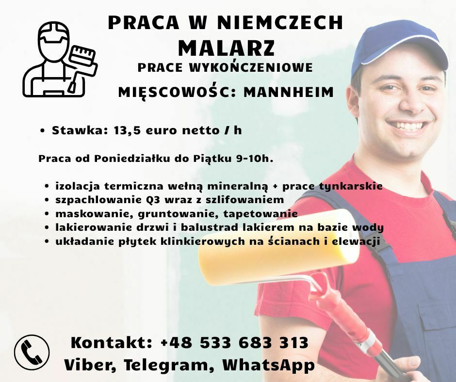 Poszukujemy malarza z doświadczeniem do prac wykończeniowych.Praca w miejscowości Mannheim w Niemczech.