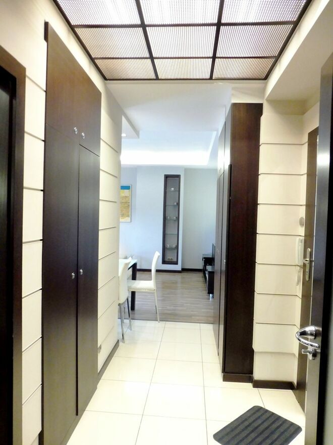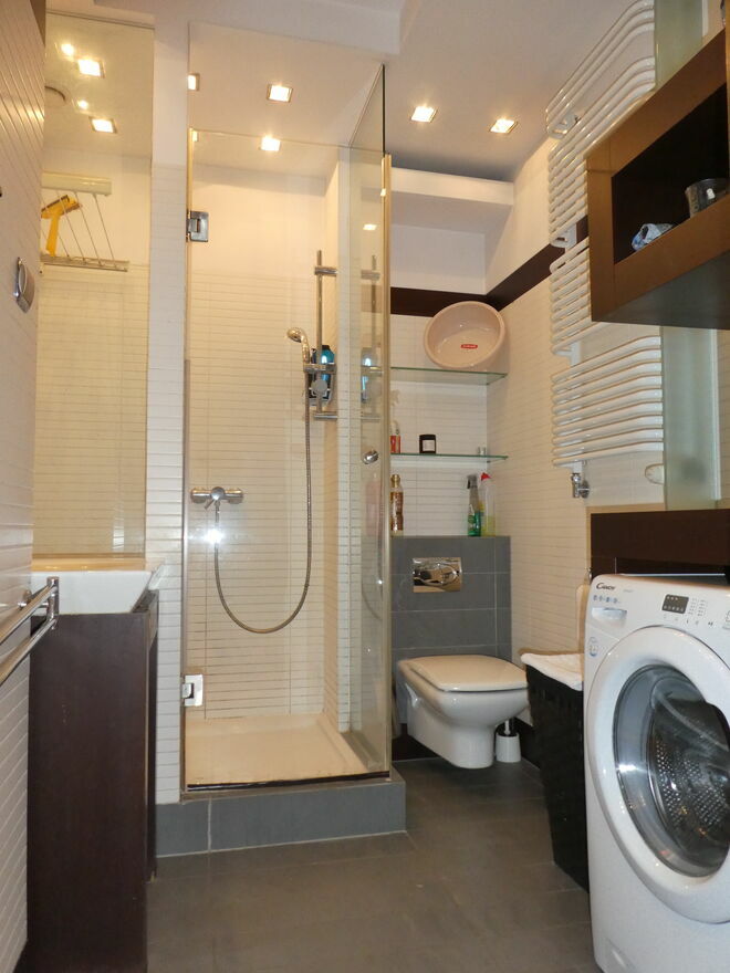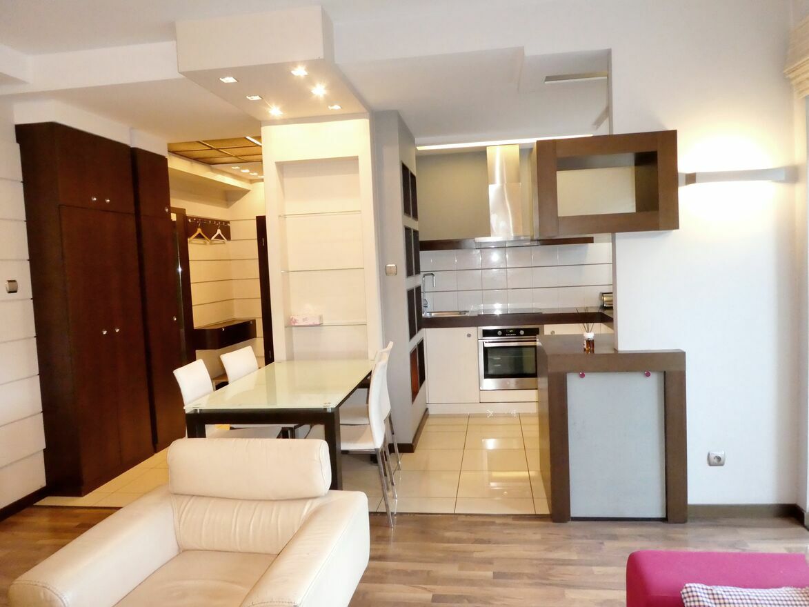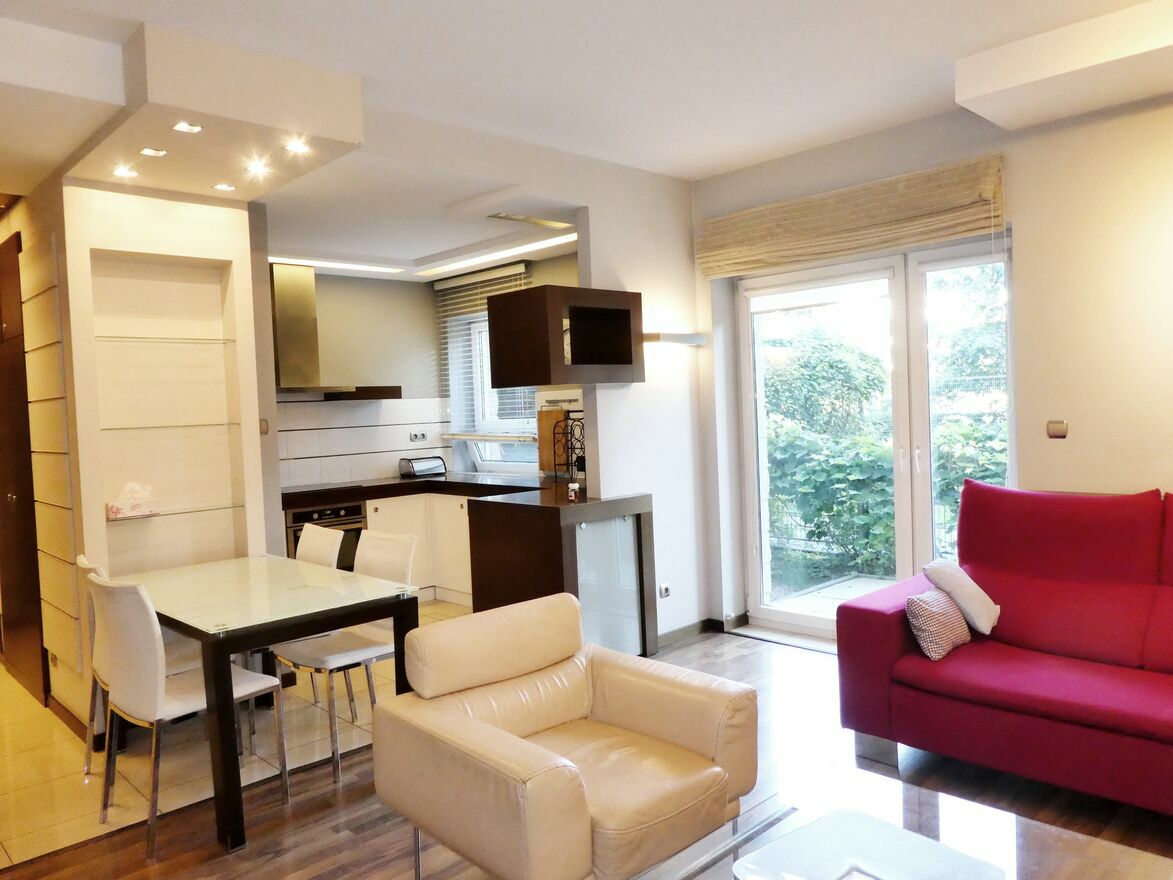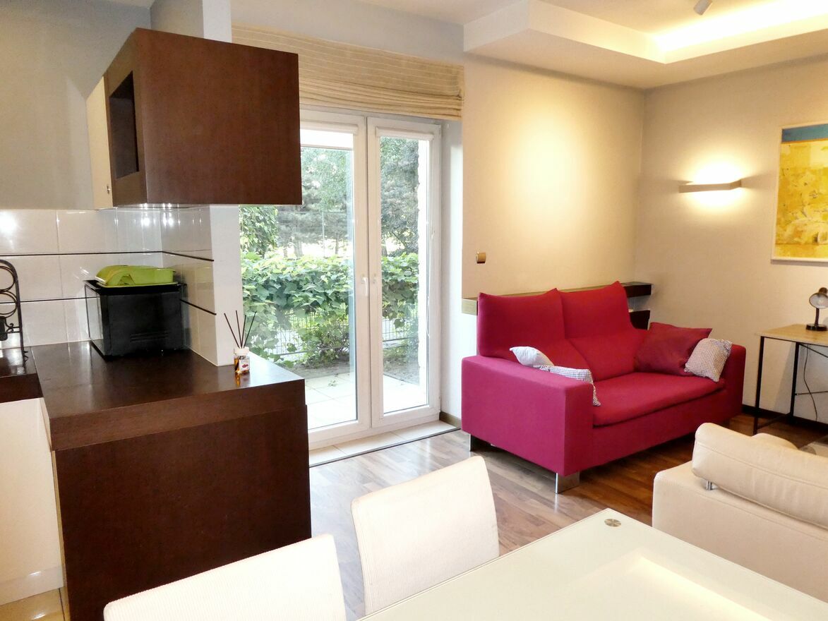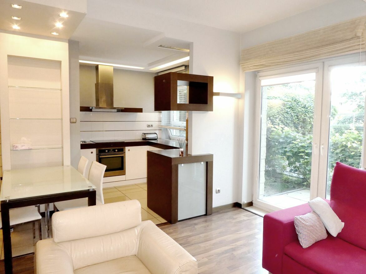 Apartament 2. pokojowy na parterze, z ogródkiem i widokiem na przyjemną wewnętrzną zieleń osiedla oraz jeziorko. Mieszkanie nietuzinkowo wykończone: liczne podsufitowe doświetlenia w tym sufity dystansowe (kuchnia, łazienka, przedpokój, salon) - funkcjonalne systemy podświetleń – projekt plastyka/architekta; drewniane podłogi, przemyślane - wbudowane mini szafki (kuchnia), półki (salon) ozdobne ściany (przedpokój), itp. Mieszkanie w pełni wyposażone: sprzęt AGD/RTV, akcesoria kuchenne, pościel itp.