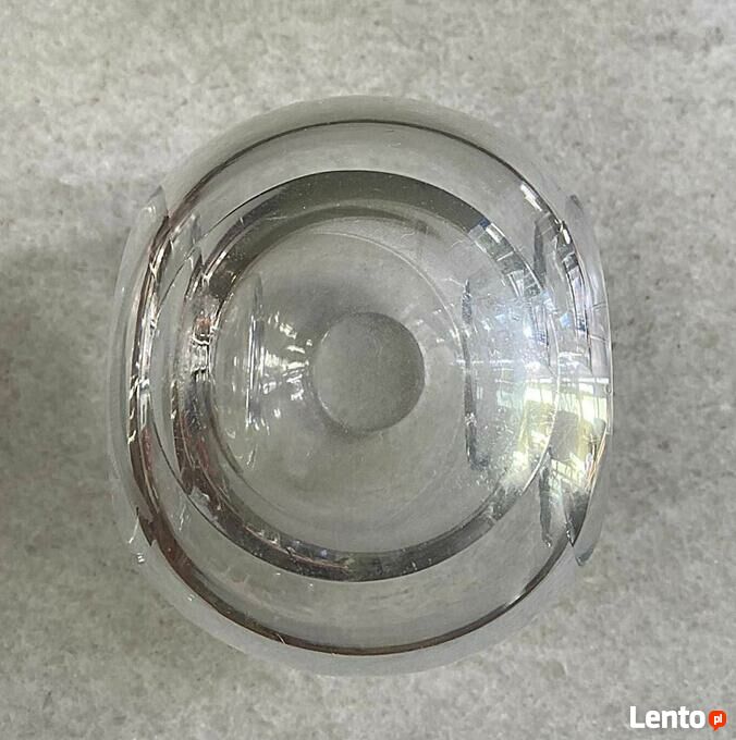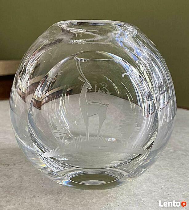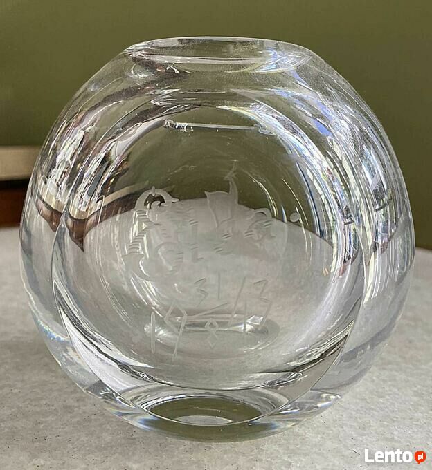 Masywny, niski, szklany wazonik z pamiątkowym grawerunkiem "Elsa 31/8/1943 " oraz wizerunkiem rogatego zwierzęcia,wazonik w kształcie kuli ściętej sferycznie, całkowicie transparentny,