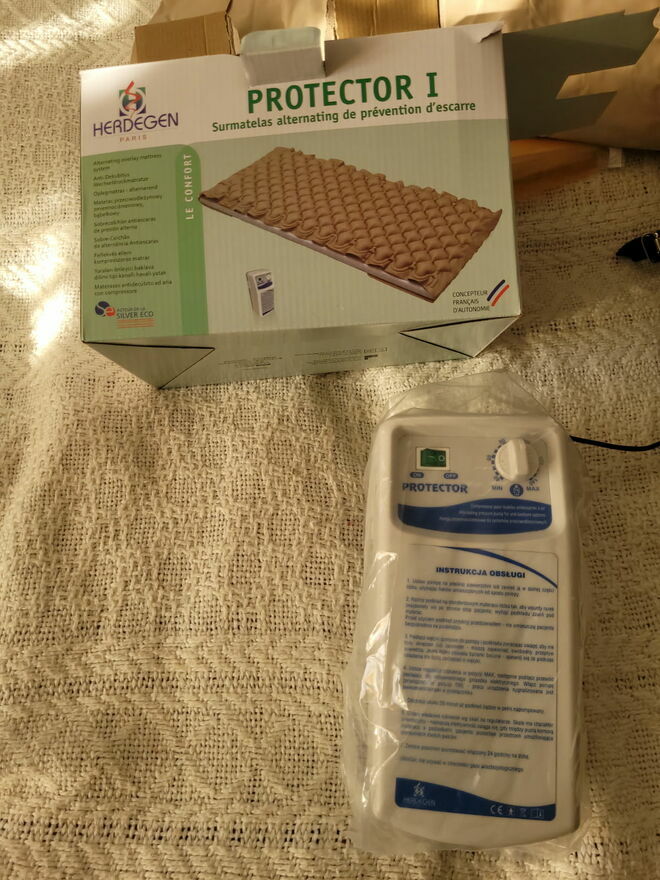 Odbiór osobisty Warszawa Wola lub wysyłka .antyodleżynowy, bąbelkowy PROTECTOR 1 od firmy Herdegen / Aston, przeznaczony jest do profilaktyki i wspomagania leczenia odleżyn. Dzięki budowie opartej na podzieleniu materaca na komory powietrzne (bąbelki), pozwala na równomierne rozłożenie ciężaru ciała pacjenta, prawidłową wentylację (natlenienie i odprowadzenie wilgoci) oraz, dzięki doskonałym właściwościom izolacyjnym powietrza, na komfort temperaturowy. Wszystkie te czynniki są decydujące w profilaktyce i leczeniu odleżyn.