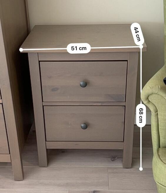 Szafka nocna IKEA HEMNES z dwiema szufladami w kolorze szarobrązowym. Wymiary: 51×44×68 cm – klasyczny model z litego ...
