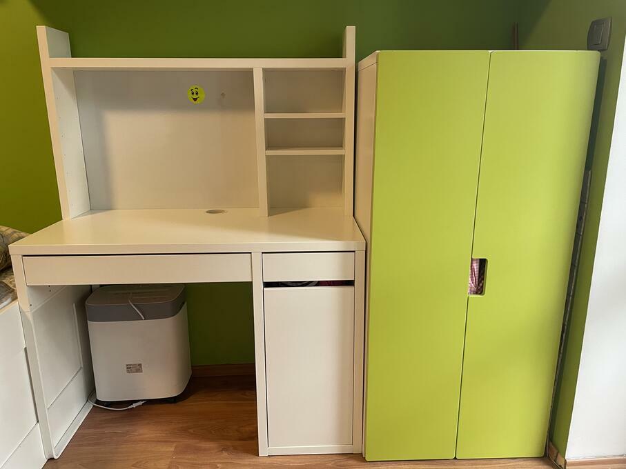Sprzedam zestaw mebli Ikea,: biurko 105 cm, z megnetyczna tablicą, szafa 60x130, 2 szafki 30 cm x 60, 2 szafki z szufladami 50x60. Stan dobry, Jedna szafka. Posiada zarysowania na wierzchu widoczne na zdjęciu. Odbiór tylko osobistySprawdź zainteresowanie tym ogłoszeniem