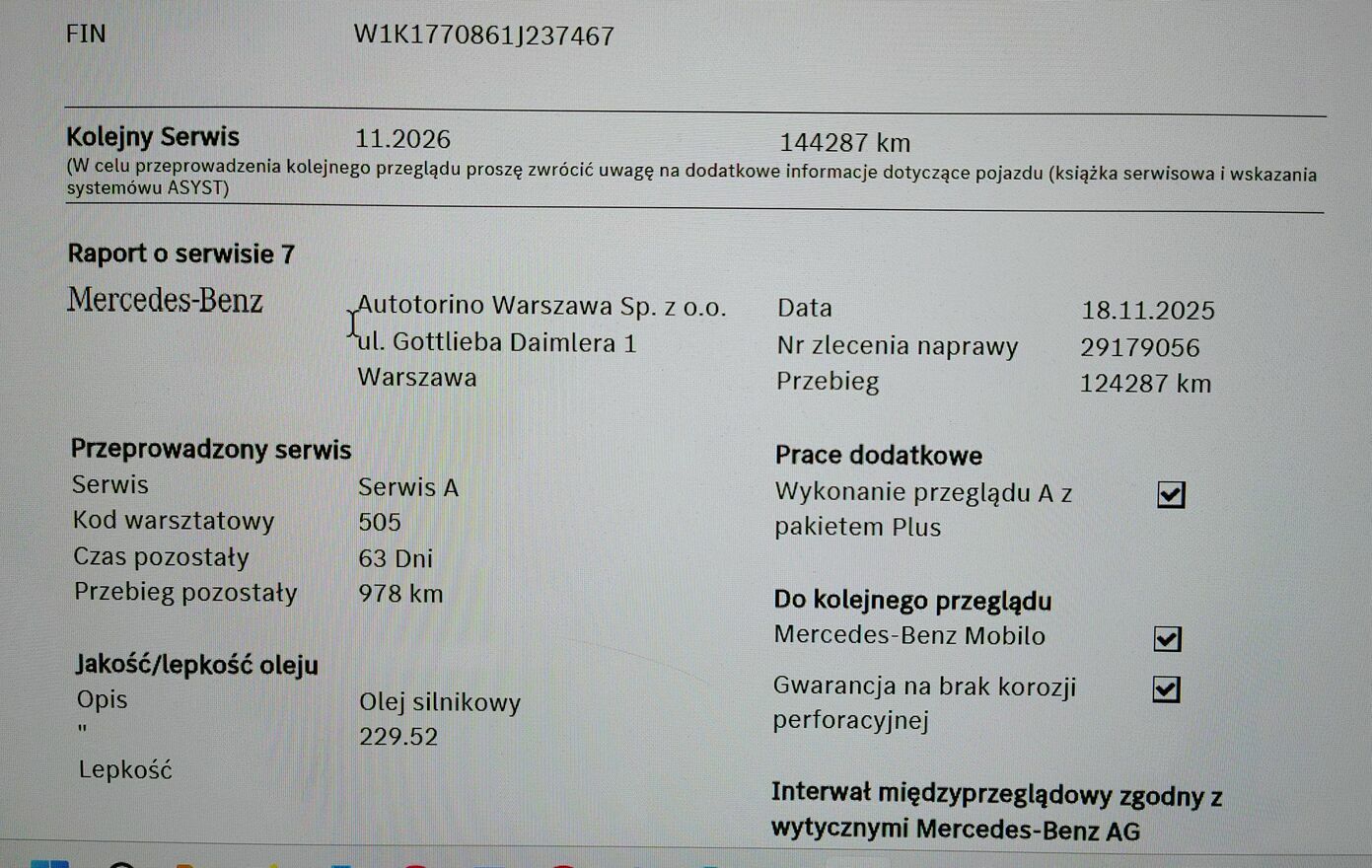 Przegląd został zrobiony w ASO Autotorino Warszawa Sp. z o.o. ul. Gottlieba Daimlera 1 Warszawa.