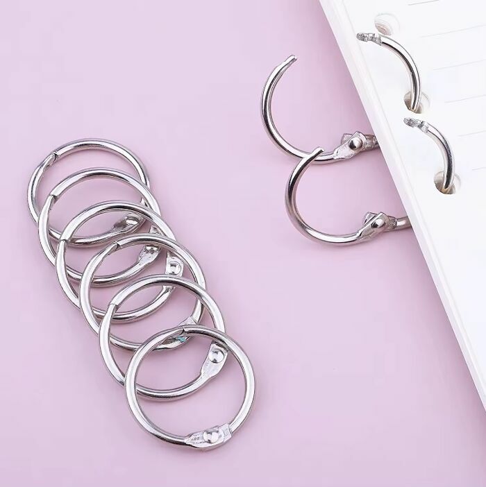 Metalowe, niklowane pierścienie z zapięciem.Pierścienie np. do oprawy dokumentów, łączenia menu, dokumentów, kluczy