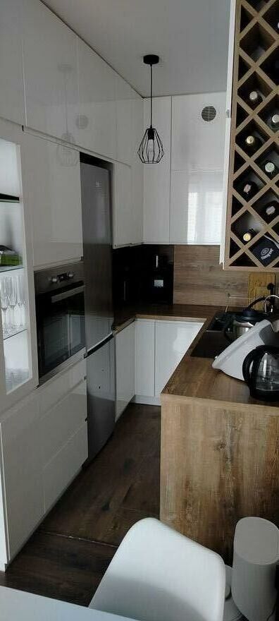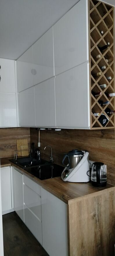 Kuchnia marzeń: Kompaktowa, ale w pełni wyposażona (piekarnik, płyta, nowoczesny okap, miejsce na ekspres). Drewnopodobne blaty świetnie komponują się z białą lakierowaną zabudową.