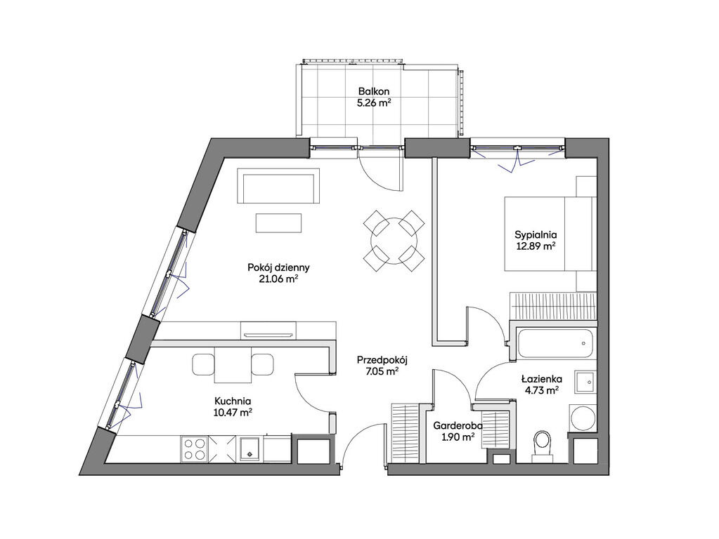 salonu (21,06 m²)kuchni (10,47 m²)sypialni (12,89 m²)łazienki